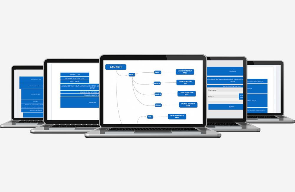 - the complete step-by-step walkthrough of our launch process: the marketing, the strategy, the funnels, the systems, and the social media and the email content.